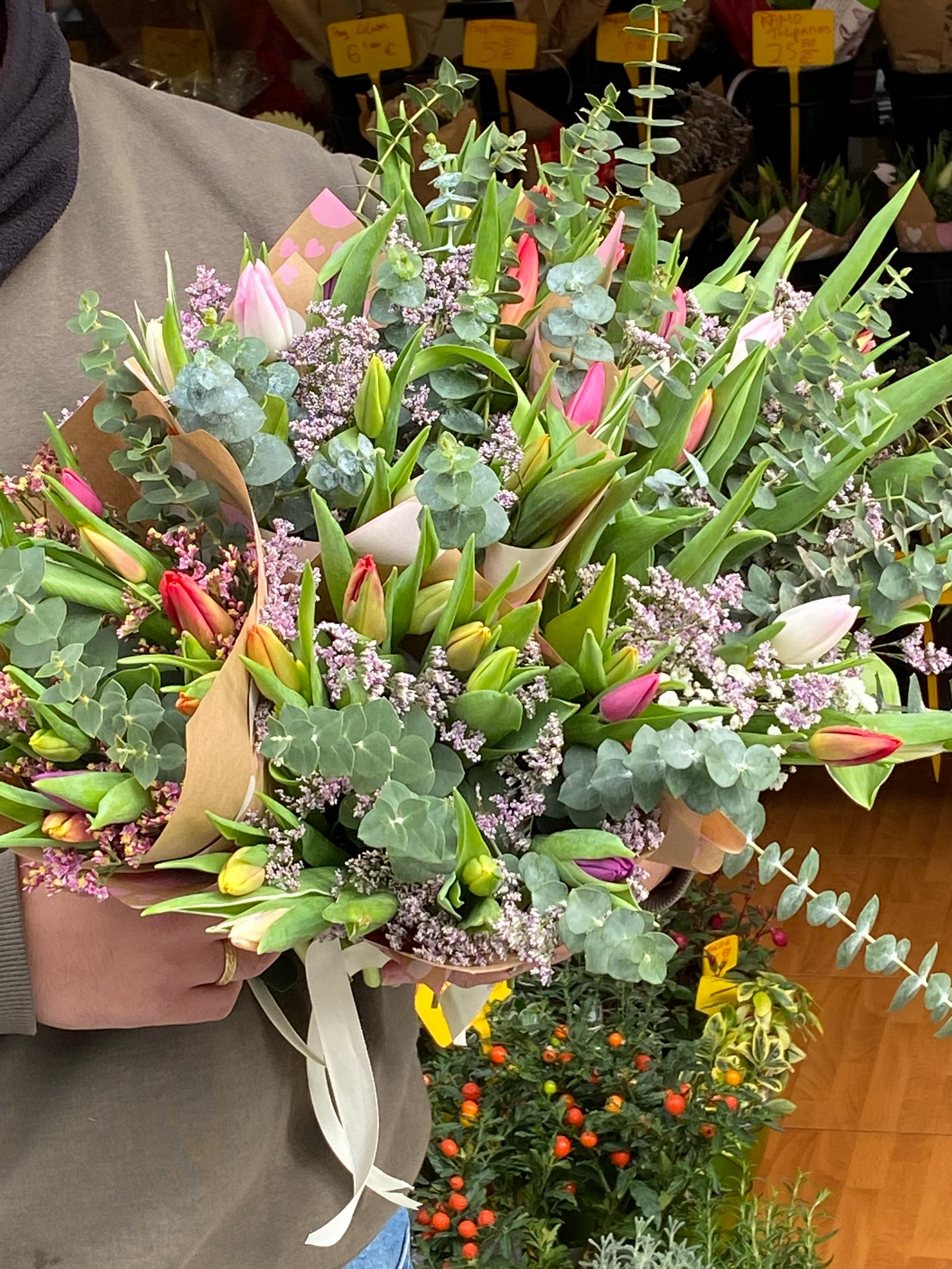 Ramo completo de 10 Tulipanes acompañado de frescas hojas de eucalipto y delicados rellenos que realzan su belleza natural.